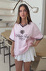 I'm nicer when I like my outfit. The Along The Way Oversized Jersey in Pink brings effortless cool to your wardrobe. Features a relaxed V-collar neckline and short sleeves with sporty stripe detailing at the cuffs. The centre front is embroidered with White Fox text paired with a rose graphic for a stylish statement. Designed with an oversized silhouette that’s perfect for laid-back days, and finished unlined. Style with a mini skort and your fav trainers for a sporty yet chic look!
