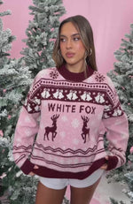 Cosy meets cute under the mistletoe. The Arctic Fire Knit Sweater in Crimson Twist is designed with slouched shoulders and ribbed hems, which round out an oversized silhouette. Featuring long sleeves and an unlined knit fabric. Finished off with White Fox text centre front and back, paired with a Christmas-inspired design. Style with colourful lounge shorts, slippers and some Christmas-inspired socks.