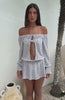 Introducing the mini you'll be packing for every vacation! The Back To Shore Long Sleeve Mini Dress Cream/Choc Stripe features an off the shoulder design with elasticated hem, long sleeves, centre front cut out detailing with self tie, elasticated at waist, mini length and slightly sheer, unlined material. Pair over the top of our Bikini Top and Bottoms in Cream/Choc Stripe!
