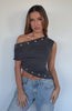+24 loyalty pointsEmbrace your cool side in the Can't Look Back Off Shoulder Top Dark in Grey Marle! Features a one shoulder neckline with ruching detailing on arm, overlay fabrication on bust, asymmetrical hemline and silver eyelet detailing on neckline and hemline. Complete the look with your fav White fox denim jeans and layered gold jewellery for a cool girl fit!