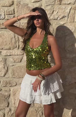 +40 loyalty pointsMeet our dreamiest new piece, the Just Over You Sequin Halter Top in Kiwi! Features halter neck self tie straps, scoop neckline, semi-cropped, backless and zipper with hook and eye closure. Complete the look xx