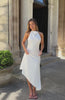 Be Santa's cutest helper in the Night Hustle Halter Midi Dress White! Features halter straps, a high neckline that balances its daring backless silhouette, and flattering ruching at the hips. The asymmetrical hemline adds modern flair, while a side zipper with hook-and-eye closure ensures a seamless finish. Fully lined for comfort. Style with xx and you are ready for festive magic.