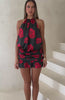 +50 loyalty pointsThe ultimate cool-girl dress has arrived! Our No Second Thoughts Halter Mini Dress Black Scarlet Bloom features thin halter straps tied at the nape, loosely fitted bodice, fixed hemline on waist, ruched detailing down skirt side, ruffle hemline on skirt, invisible zipper on side, backless and lined. From beach clubs to dinner dates, she's got an effortless feel when paired with heels and layered gold jewellery.