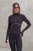 OBSESSED! The Persistence Jacket in Black/White features a sleek front zipper closure, long sleeves, and a fitted silhouette that flatters your shape. Under-bust piping adds structured detailing, while zippered pockets offer secure storage. The jacket is finished with bold WFA initials at the center back and crafted from high-stretch fabric for maximum mobility. Style with the matching Ace High Waisted Leggings.