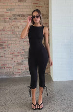 +40 loyalty pointsFeel effortlessly chic in the Problem Solved Sleeveless Jumpsuit in Black. This sleek piece features a jewel neckline, a fitted silhouette, and side splits at the pant hem adorned with self-tie bows. Crafted from high-stretch, unlined fabric, it offers both comfort and style. The backless design adds a daring touch, while the capri-length pants complete the look with modern flair. Style with kitten heels and layered gold jewellery for an effortlessly elevated fit.