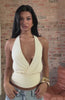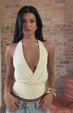 Stop them in their tracks when you pull up in the Show Stopping Halter Top Cream. Crafted from high stretch fully lined fabrication, this top features fixed halter straps, a plunge neckline, under‑bust ruched seam, fitted bodice, and daring open back. Style it back with your go-to denim jeans and sandals for the perfect girls long lunch.