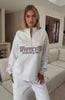 Lounge life just got a whole lot cuter. The Standing My Ground Zip Front Sweater Grey Marle is designed with slouched shoulders and ribbed hems which round out an oversized silhouette. Featuring long sleeves, front quarter zipper closure, and an unlined fleece interior, this hoodie delivers a cozy feel. White Fox embroidered text embellishes the centre front. Style with Standing My Ground Wide Leg Sweatpants or Standing My Ground Lounge Shorts.