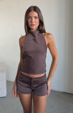 +35 loyalty pointsYour glow‑up uniform: the Time Passes Mini Shorts in Chocolate feature a sleek, fully lined mini cut with a thick waistband, zipper, button, and hook‑and‑bar closure—all crafted in luxuriously silky fabric. Style them with the matching Time Passes Halter Top in Chocolate and a pair of chic kitten heels for an effortlessly polished set.