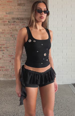 +40 loyalty pointsThe brief: Cheeky. Slide into the Wild Attraction Mini Shorts in Black, featuring a delicate lace-trimmed elastic waistband, a playful frill sash tied at the hip, and a clingy booty-length cut in high-stretch fabric for unapologetic, bold comfort. Layer with the Closer To Forever Halter Top and chunky gold jewellery for a dream festival fit.